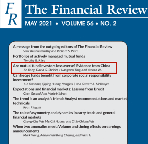 江婕, David G. Shrider, Huangwen Ting, 伍燕然(通讯作者):"Are mutual fund investors loss averse? Evidence from China", FINANCIAL REVIEW,22 September 2020.