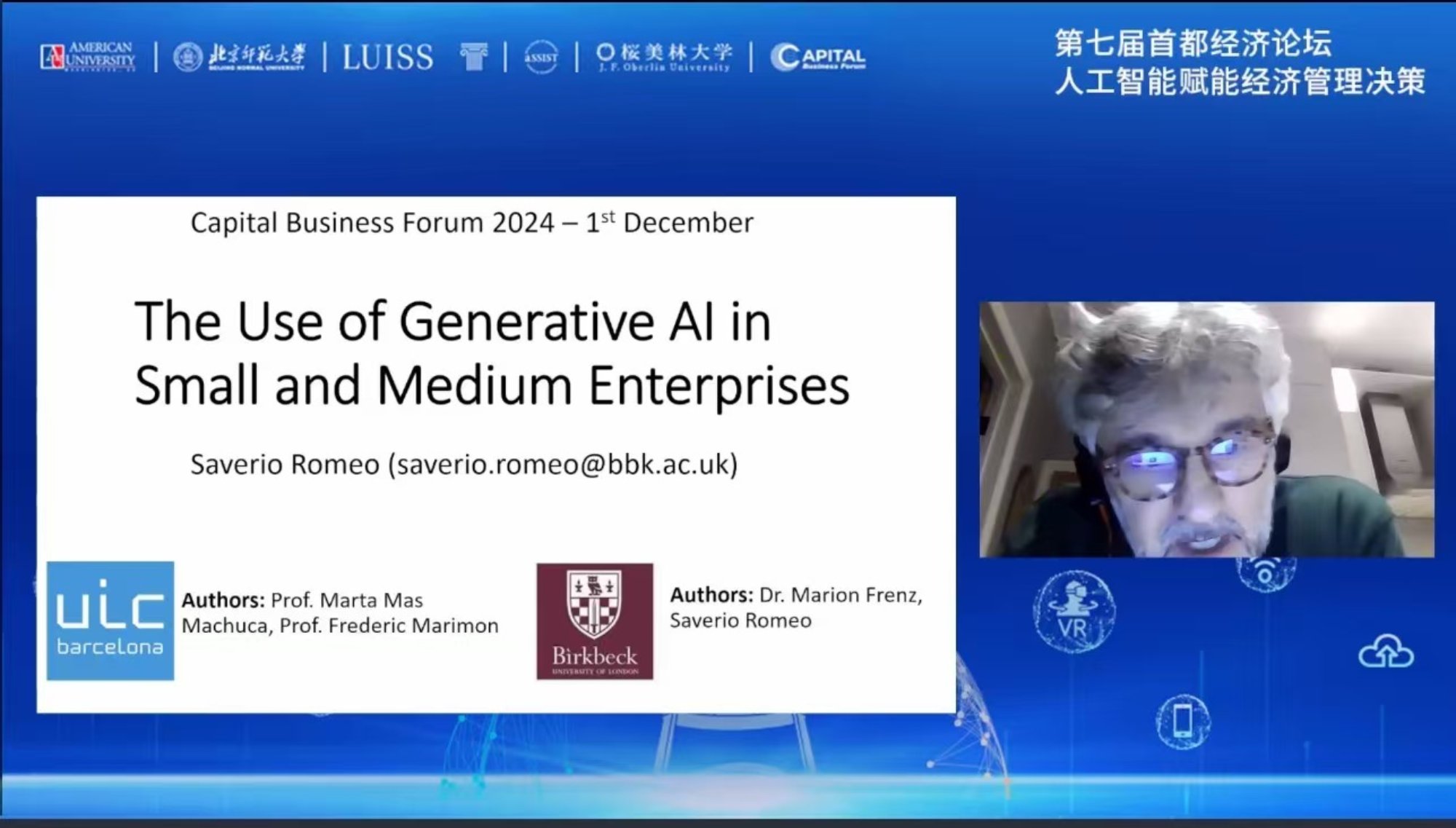 伦敦大学贝克成人视频 高级讲师萨维里奥·罗密欧以“The Use of Generative AI in Small Businesses”为题,从研究背景、样本描述与分析,以及结论等几方面展开讨论。他指出,生成式人工智能工具已经成为日常工作生活中的一部分,生成式人工智能的应用使得员工的绩效得到了改善。