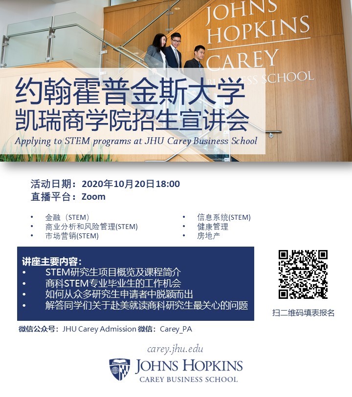 约翰霍普金斯大学凯瑞商成人视频 (Johns Hopkins University, Carey Business School)将于2020年10月20日举行Zoom线上宣讲会,欢迎感兴趣的同学报名参加。